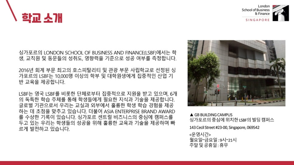 그럼 지금부터는 싱가포르 LSBF의 영어연수과정에 대해 자세히 안내드리겠습니다.