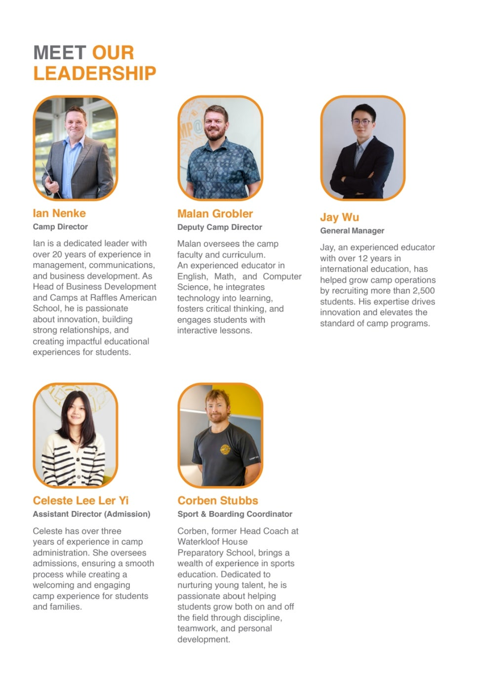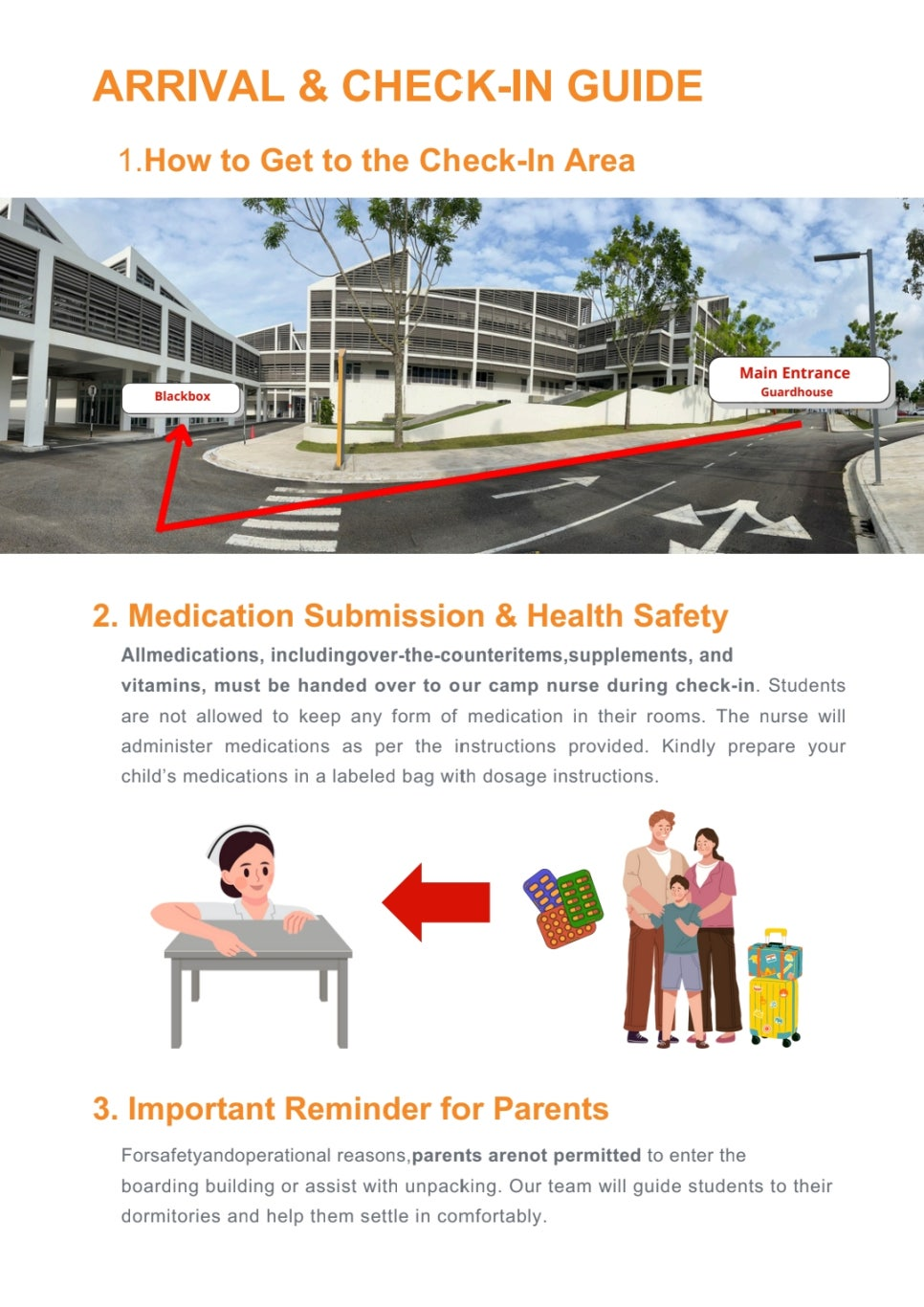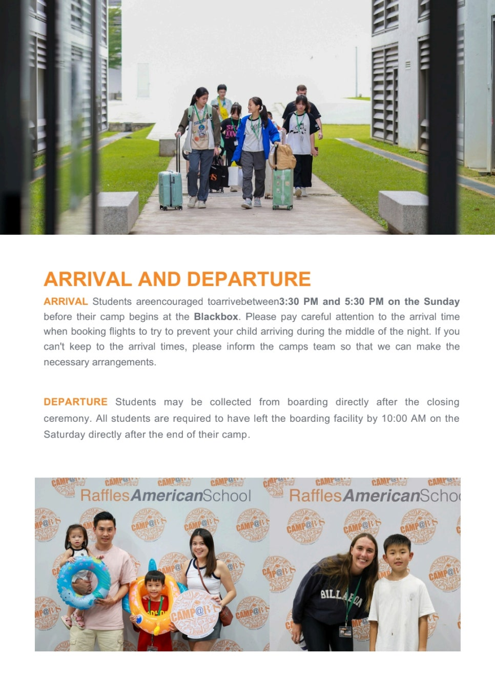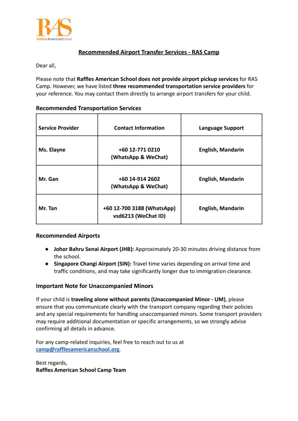 말레이시아 래플스 아메리칸 스쿨에서는 공항 픽업을 제공하지 않습니다. 캠프 참여 학생은 스스로 싱가포르 창이 공항이나 조호바루 세나이 공항을 이용하여 학교에 체크인 시간인 캠프 시작 하루 전 오후 3:30~5:30사이에 입소해야 합니다.
