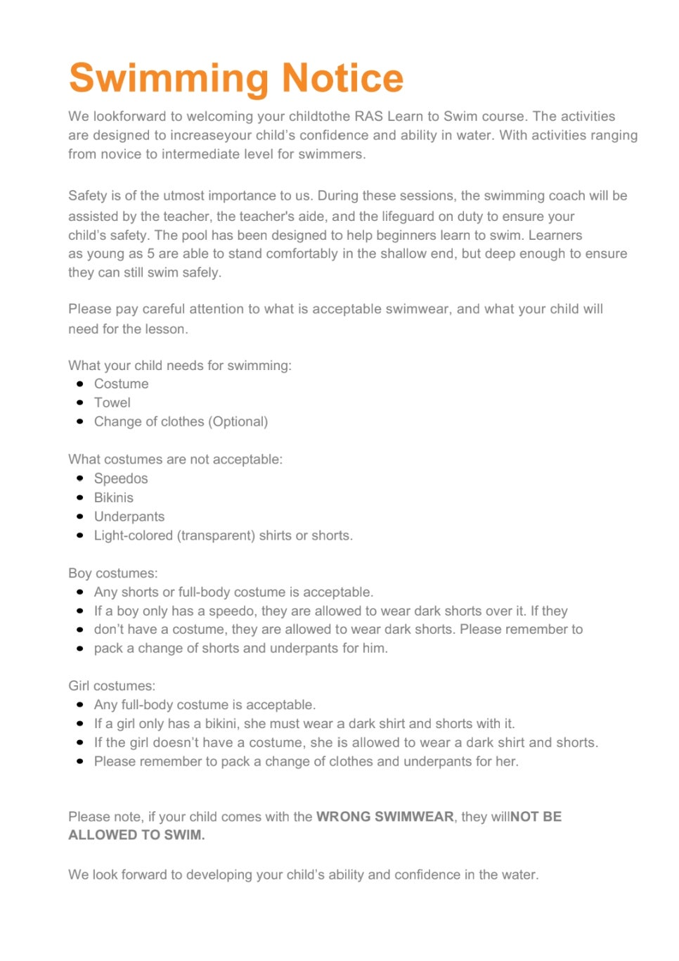 래플스 캠프에는 수영 시간이 있습니다. 여학생의 비키니와 남학생의 삼각팬티 스타일 스피도 수영복은 금지하고 있습니다.