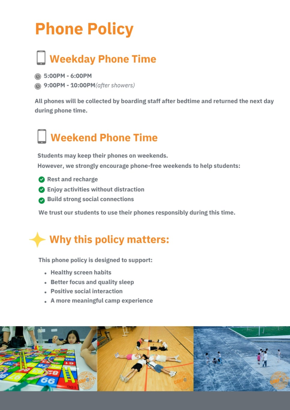 Check-in Time: 3.30pm – 5.30pm on Sunday before the start of camp.