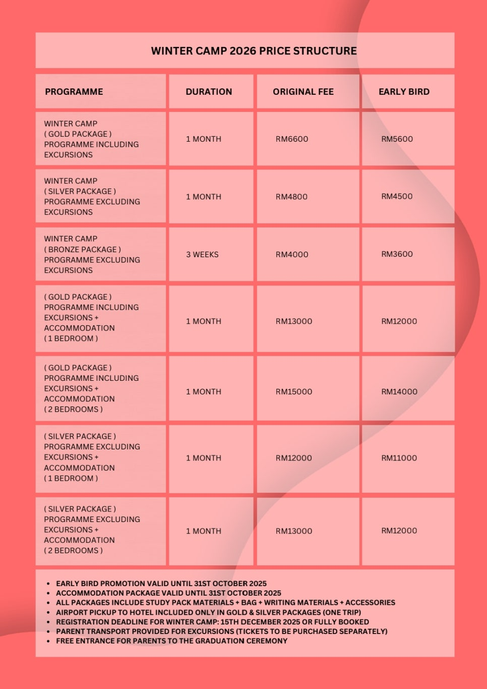 2026년 겨울 캠프 비용 안내 (10/31까지 조기등록 할인 중) : 4주 캠프 (액티비티 불포함시) 4500링깃