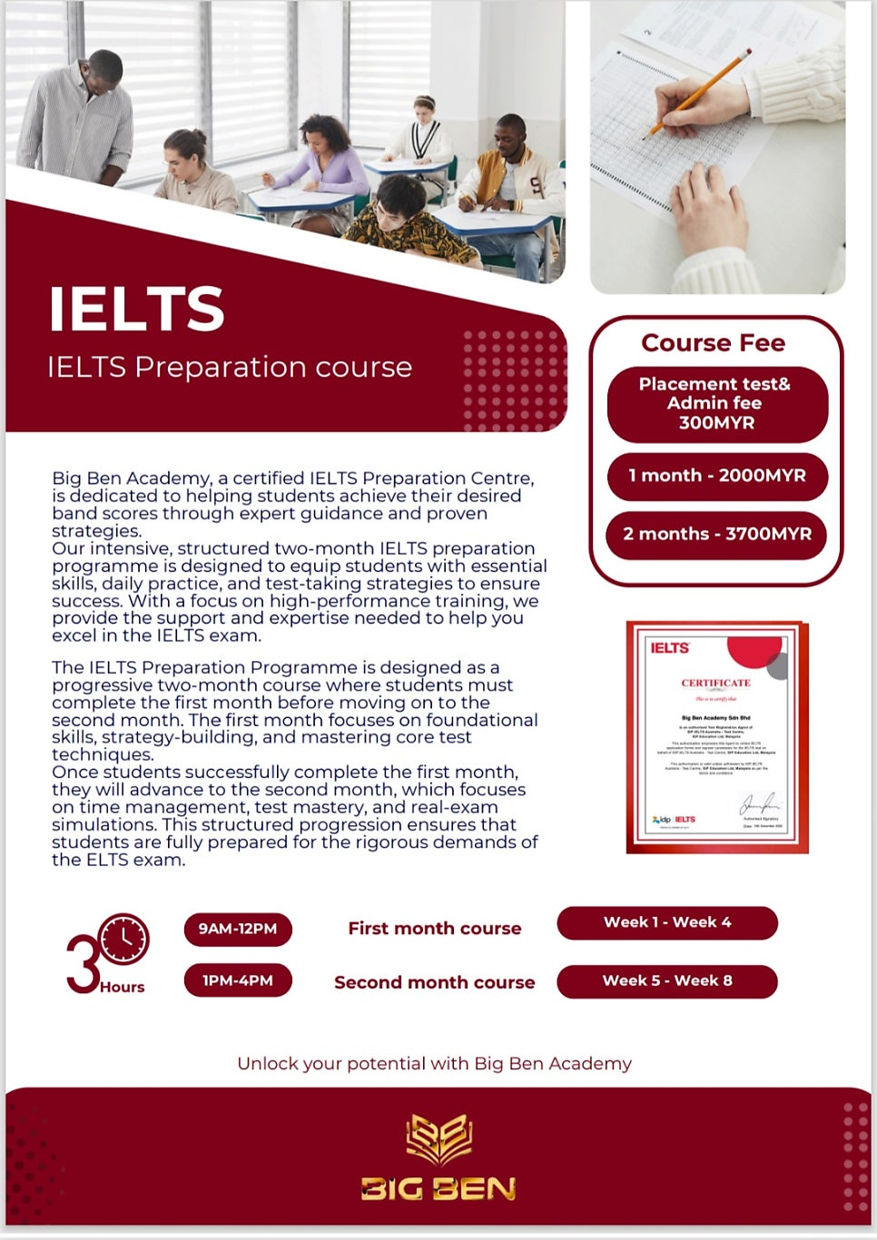 오늘은 말레이시아의 수도인 쿠알라룸푸르의 상징인 페트로나스 빌딩(쌍둥이 빌딩) 근처에 위치하고 있는 빅벤 아카데미의 성인 영어 프로그램 중 아이엘츠(ILETS) 시험 준비과정에 대해서 안내드리려고 합니다. 빅벤아카데미의 아이엘츠 준비과정은 8주과정입니다. 긴 겨울방학동안 영어공인인증 점수를 높이고자 준비하는 대학생 분들께도 추천드리는 과정입니다.
