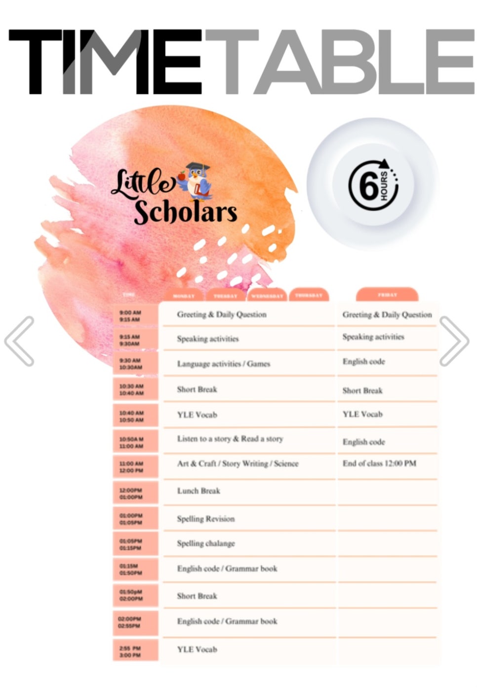 수업 시간: 월~ 목( 9am-3pm) & 금(9am-12pm)